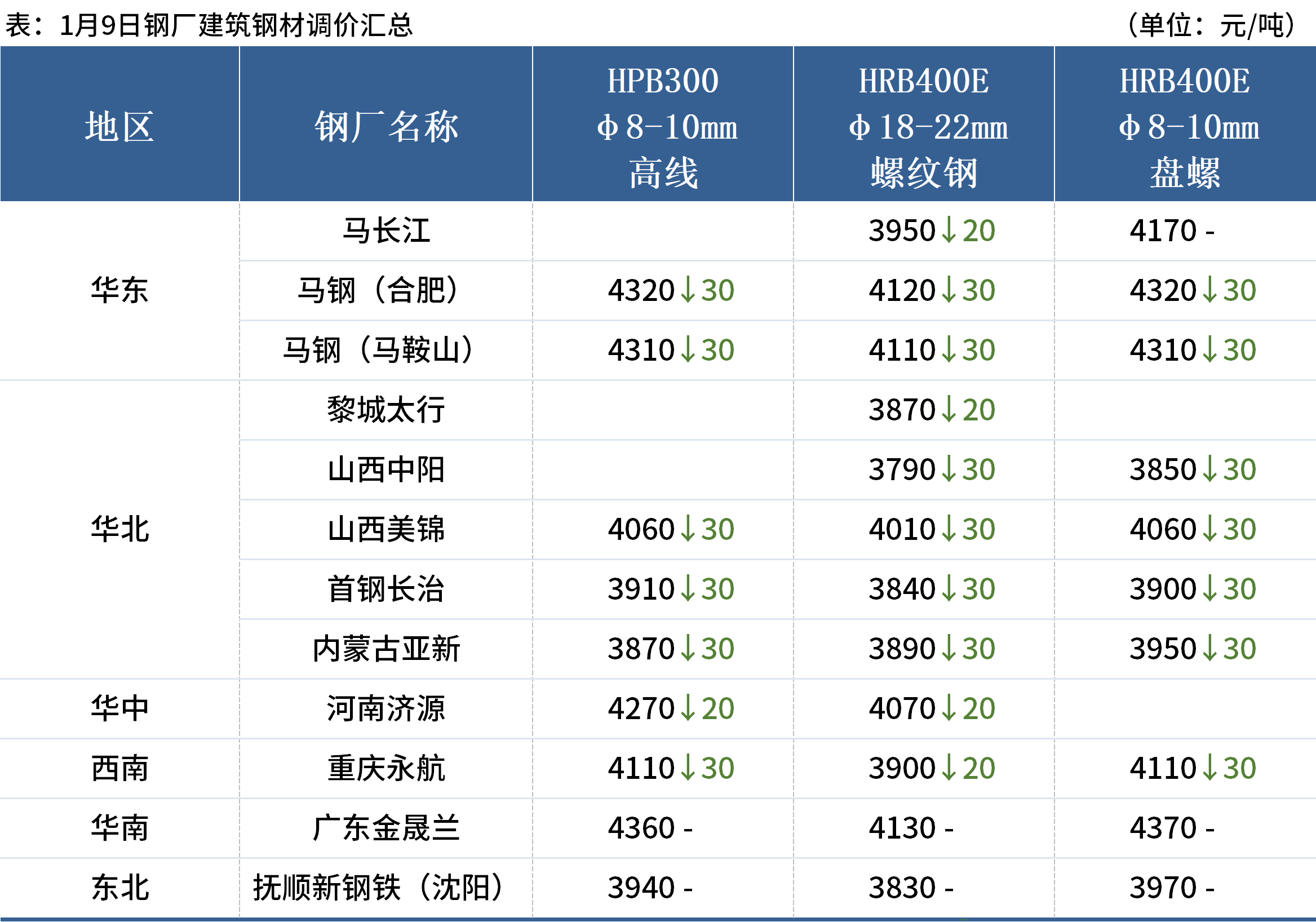 1月9日,全國(guó)累計(jì)11家鋼廠發(fā)布調(diào)價(jià)信息,其中9家鋼廠降價(jià),整體調(diào)幅在0-30元/噸。