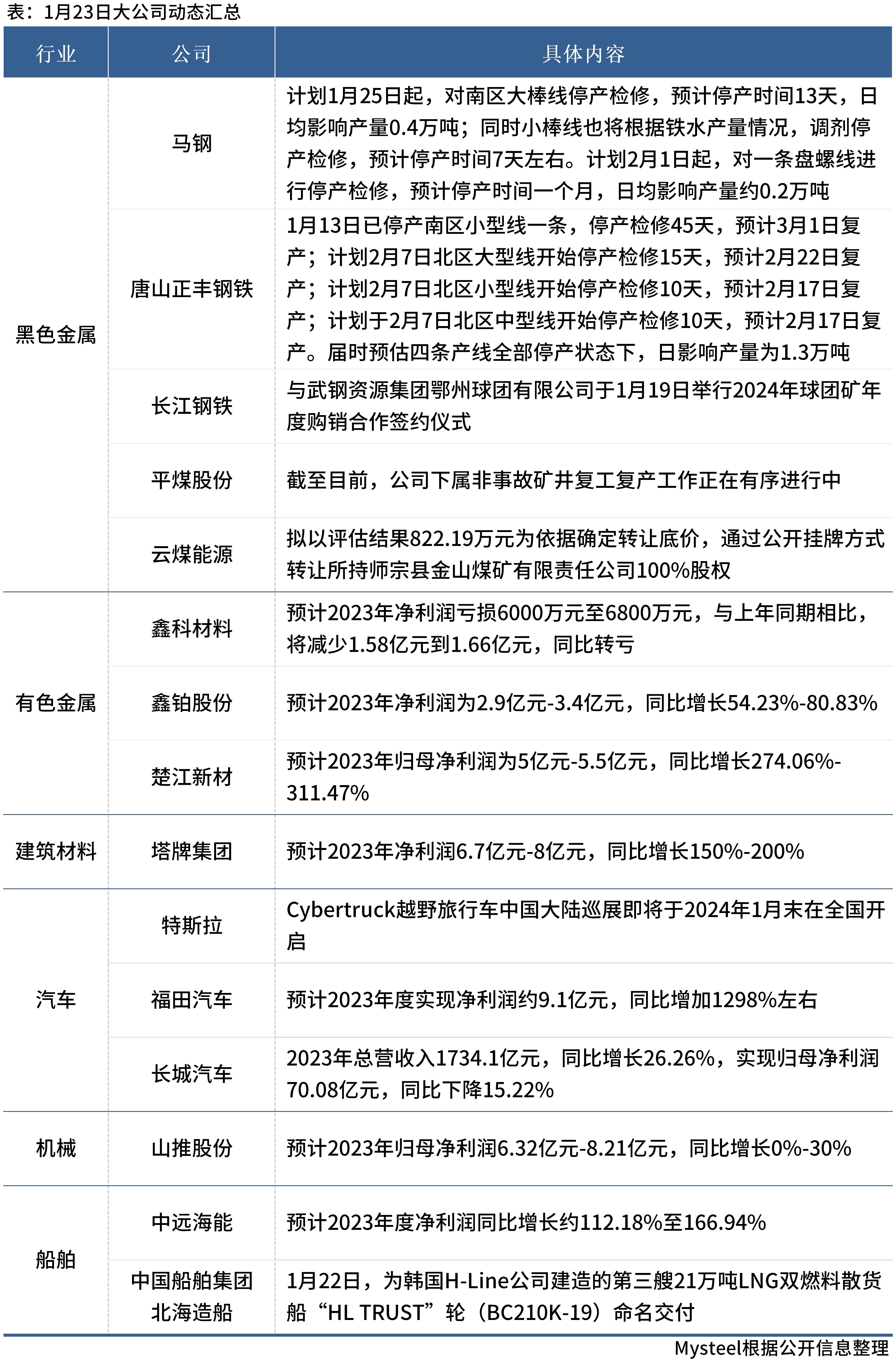 1月24日,Mysteel匯總部分大宗商品相關(guān)企業(yè)動(dòng)態(tài)。