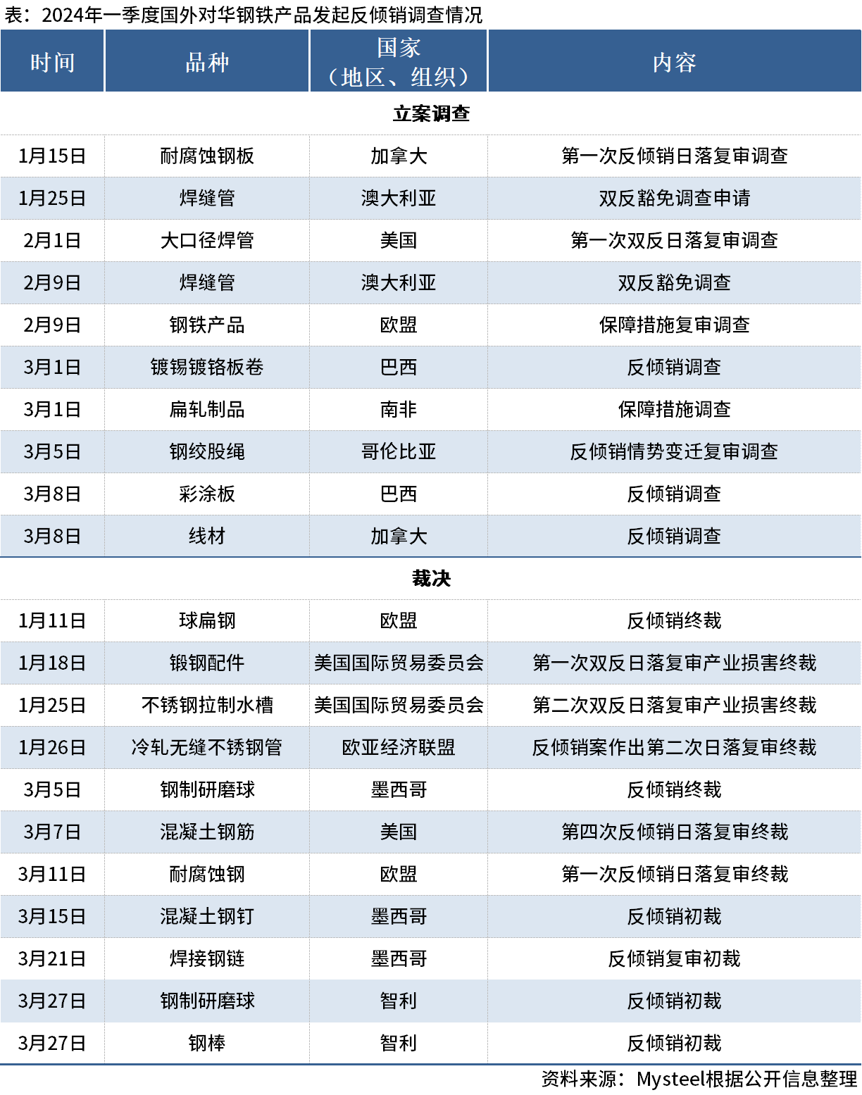 據(jù)Mysteel不完全統(tǒng)計(jì),2024年一季度中國(guó)貿(mào)易救濟(jì)信息網(wǎng)陸續(xù)公布了21起國(guó)外對(duì)中國(guó)鋼鐵產(chǎn)品發(fā)起的反傾銷(xiāo)、反補(bǔ)貼調(diào)查或裁決。涉案品種包括耐腐蝕鋼板、焊縫管、大口徑焊管、鋼鐵產(chǎn)品、球扁鋼、鍛鋼配件、不銹鋼拉制水槽、鋼制研磨球、混凝土鋼筋、鋼棒等。具體如下: